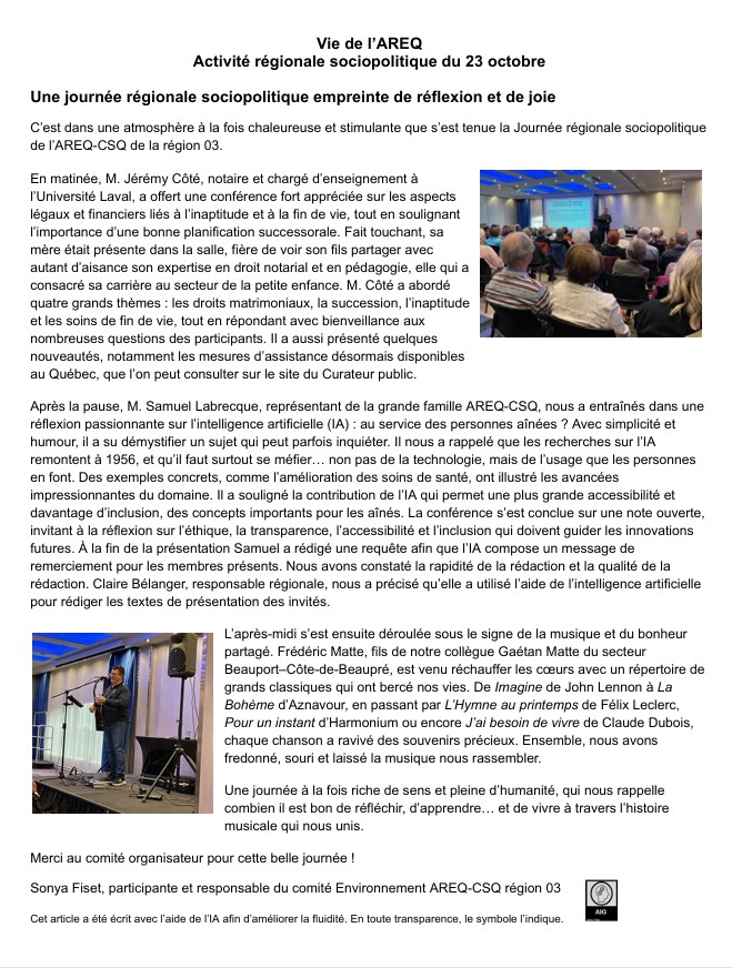Nous tenons à vous remercier de votre participation au webinaire Vieillissement et mobilité active sécuritaire, présenté par la Société de l’assurance automobile du Québec (SAAQ) et qui s’est tenu le mercredi 3 septembre de 10h à 11h30, sur la plateforme Teams. Continuer à lire…